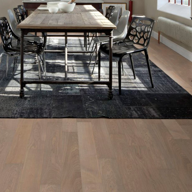 Однополосная дубовая доска в светло-серых тонах. Поверхность обработана щеткой и покрыта матовым лаком. Декор с большими вариациями цвета и умеренное количество сучков. Допускается: заболонь; сердцевинные лучи; живые сучки; зашпатлеванные черные сучки диаметром до 12 мм; зашпатлеванные трещины (средняя ширина не больше 7 мм); групповые булавочные сучки; червоточины (Ø до 2 мм).