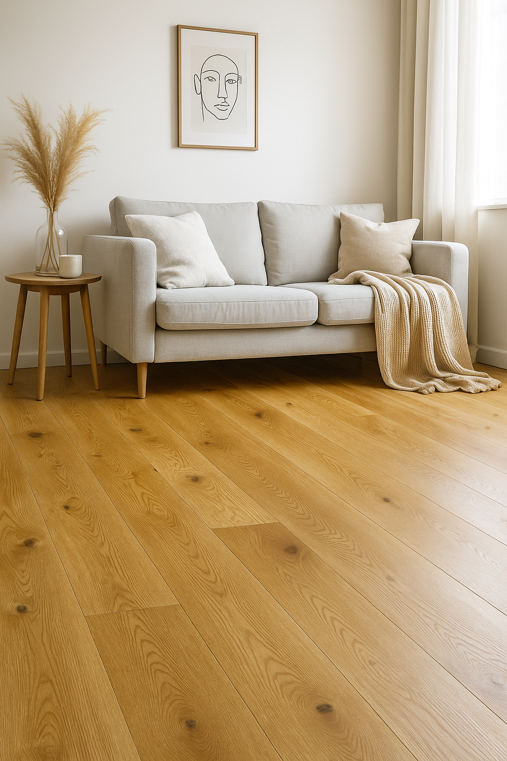 Однополосная доска из дуба под матовым лаком. Рустикальный декор. Допускается: любые вариации цвета древесины, в том числе частично коричневые ламели, заболонь, зашпатлеванные сучки и трещины любых размеров и в любом количестве, неровности и отверстия в шпатлевке.