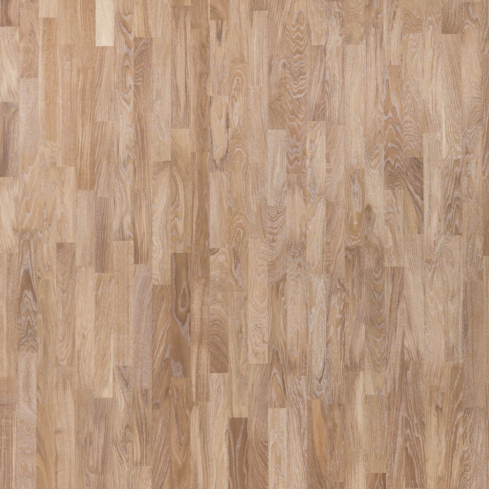 Легко брашированная трехполосная доска из дуба под белым маслом. Допускается: сильный разнотон; заболонь; сердцевинные лучи; темные полосы; редкая синева; редкие сросшиеся сучки; групповые булавочные сучки.